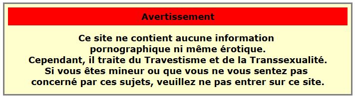 Ce site ne contient aucune information pornographique ni même érotique. Cependant, il traite du Travestisme et de la Transsexualité. Si vous êtes mineur ou que vous ne vous sentez pas concerné par ces sujets, veuillez ne pas entrer sur ce site.
